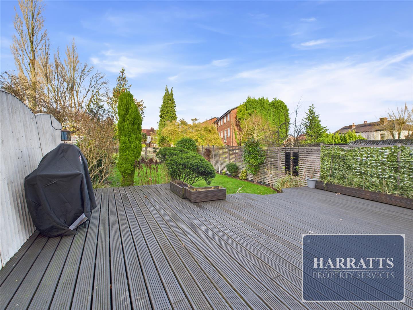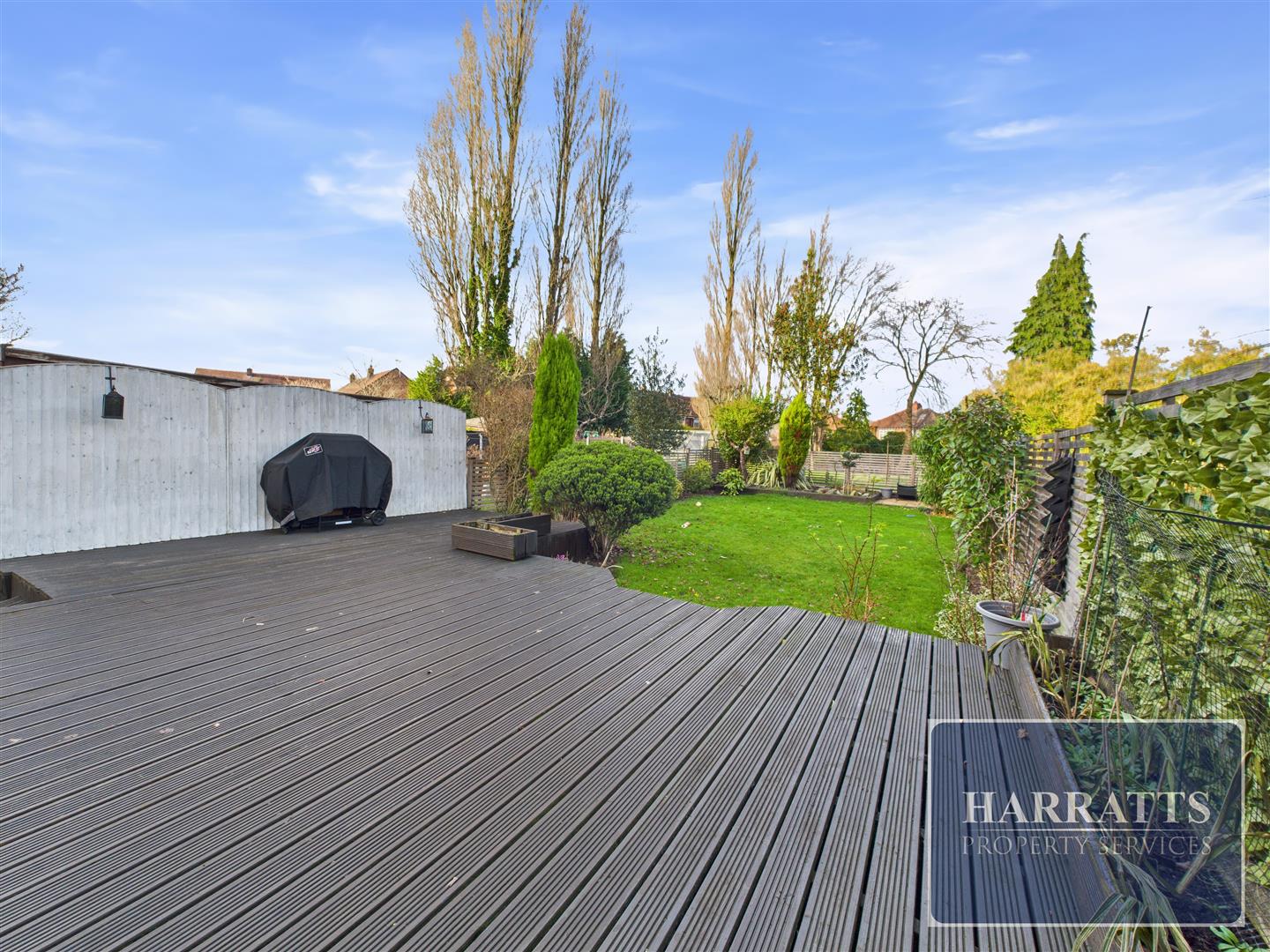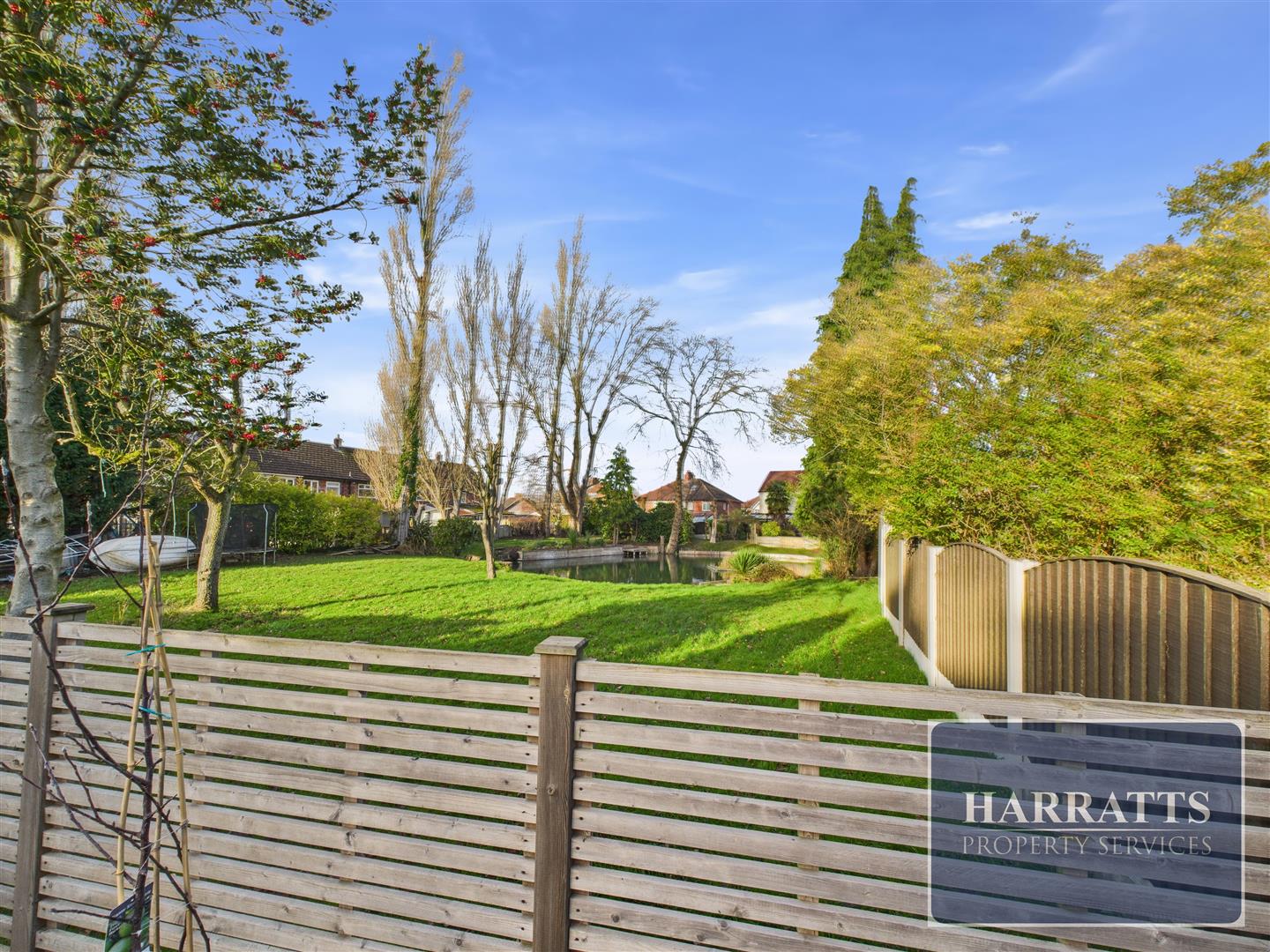 The rear garden is a particular highlight—beautifully arranged and overlooking a tranquil pond area with abundant greenery and wildlife. The main garden is attractively landscaped, laid to lawn, and bordered by mature planting. A generous decked terrace provides the perfect spot for outdoor dining, while a further patio area sits to the rear. The garden is enclosed by low-level wooden fencing, offering both charm and privacy.