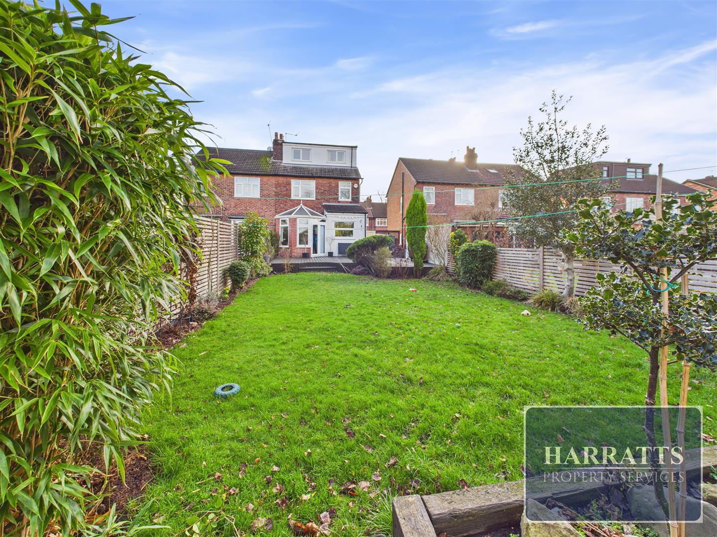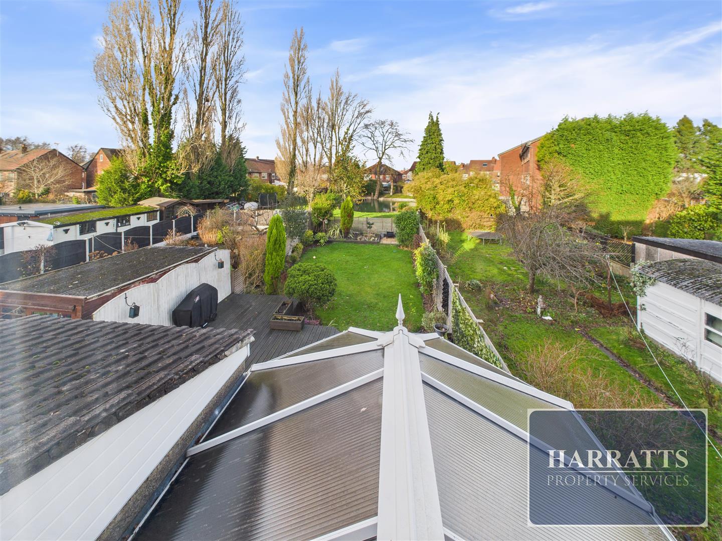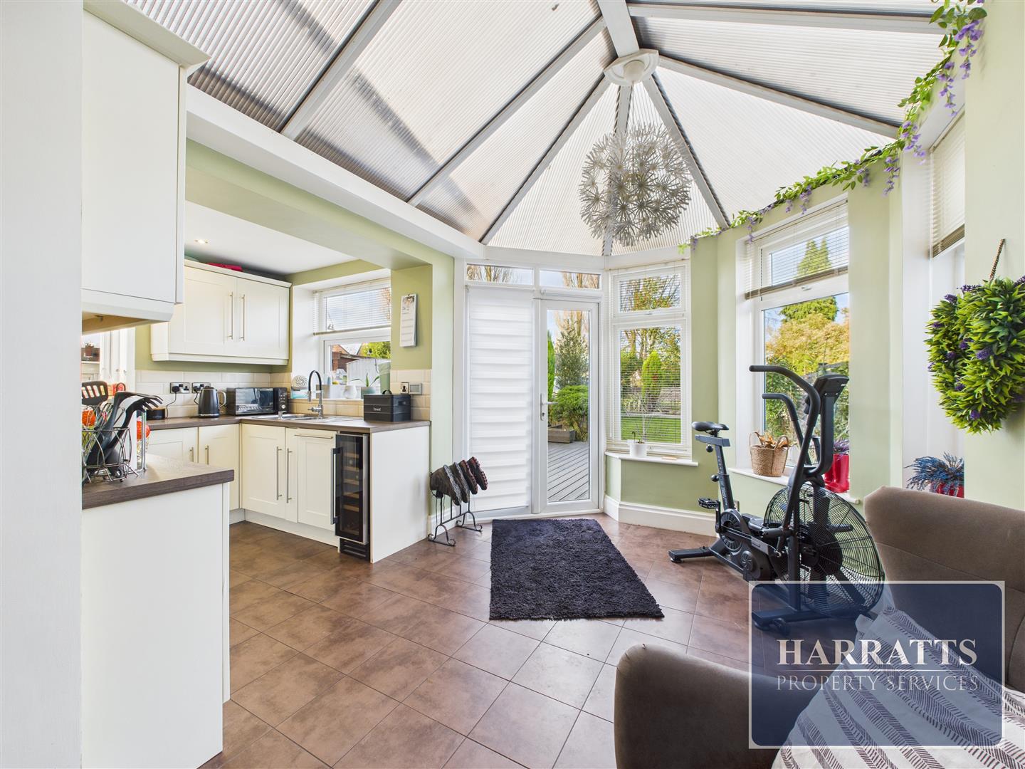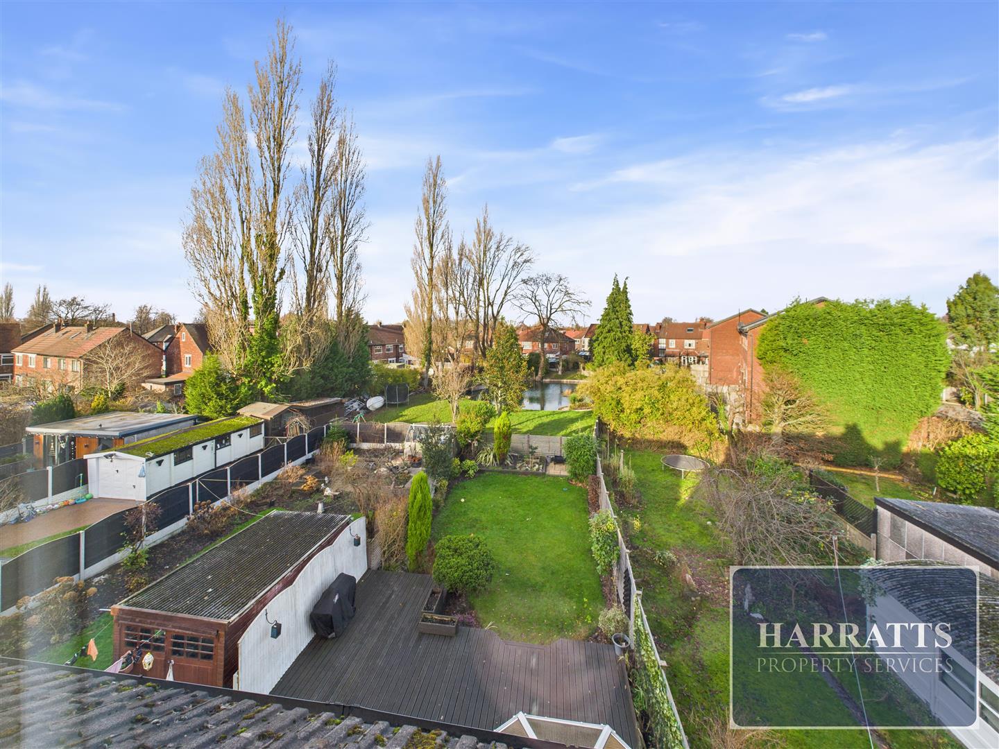 The rear garden is a particular highlight—beautifully arranged and overlooking a tranquil pond area with abundant greenery and wildlife. The main garden is attractively landscaped, laid to lawn, and bordered by mature planting. A generous decked terrace provides the perfect spot for outdoor dining, while a further patio area sits to the rear. The garden is enclosed by low-level wooden fencing, offering both charm and privacy.