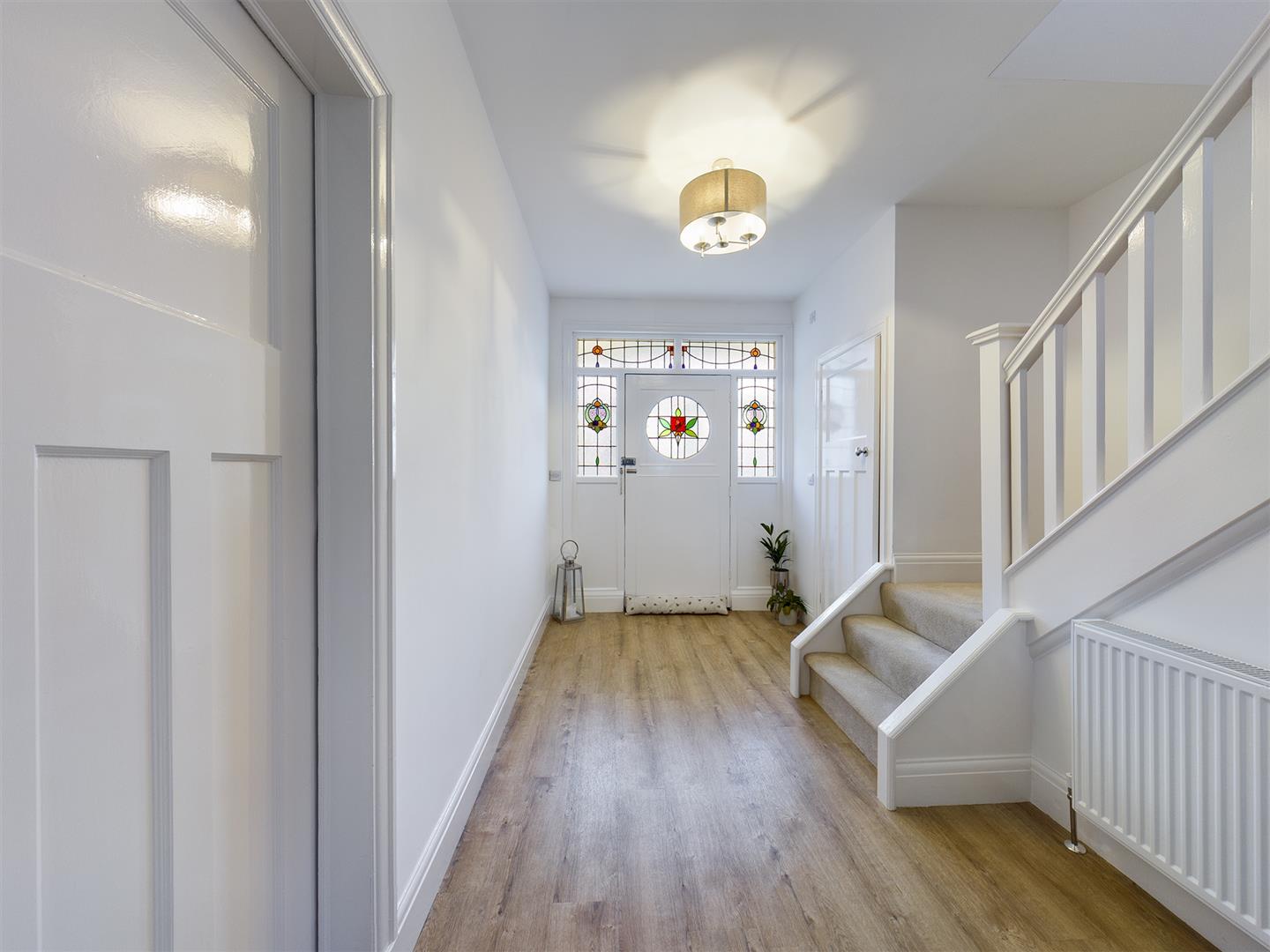 Upon entry through a modern tiled porch, a bright and welcoming hallway with stained glass windows leads to the first floor. To the rear is a beautifully designed open plan kitchen and living space, featuring a versatile central island and enjoying views over the private, mature rear garden. To the front is a spacious reception room with original features, offering flexible use as a lounge, playroom, or TV room.