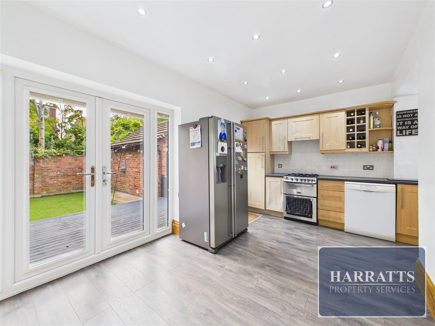 To the rear, the kitchen/diner is fitted with a range of eye-level and base units, offering ample space for appliances. French doors provide direct access to the rear garden, creating a bright and open feel.
